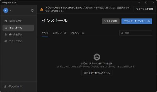 ライセンス登録されていない。ライセンス登録すればよい。以下は、無料のPersonalライセンスを登録する方法。 右上の「ライセンスを管理」をクリック。「環境設定」のウィンドウが表示される。 右上の「追加」をクリック。「新しいライセンスを加える」ウィ…